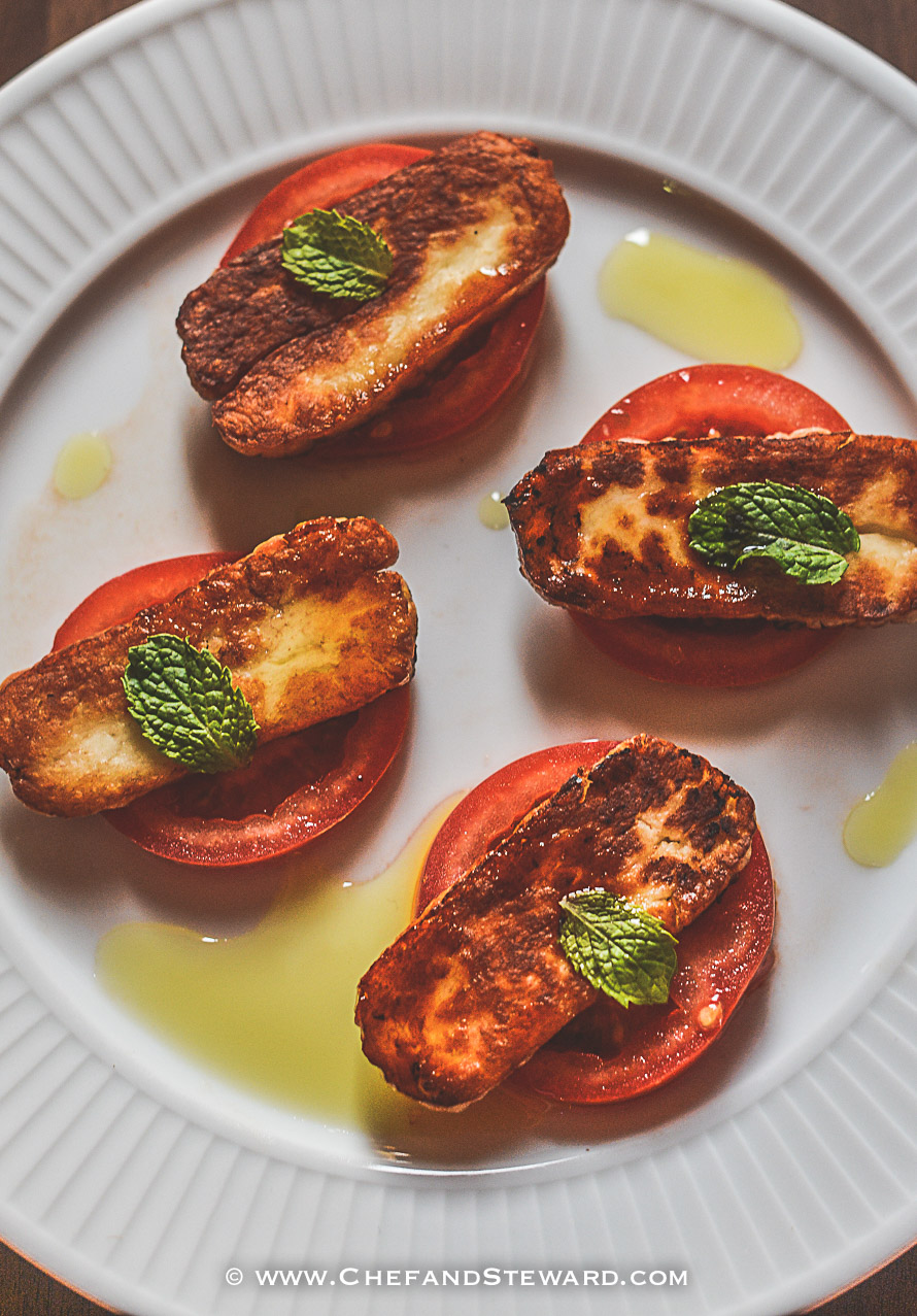 Halloumi is a very salty, hard, chewy Middle Eastern cheese and goes well with the sweet tartiness of seasonal tomatoes and fresh mint. The salad is great as a starter, for a party served in bite sizes, for afternoon tea, or for a perfectly balanced low carb paleo, gluten free, vegetarian, ketogenic meal or as a part of your mezze or small salad starter plates for a lavish breakfast, brunch or dinner meal.